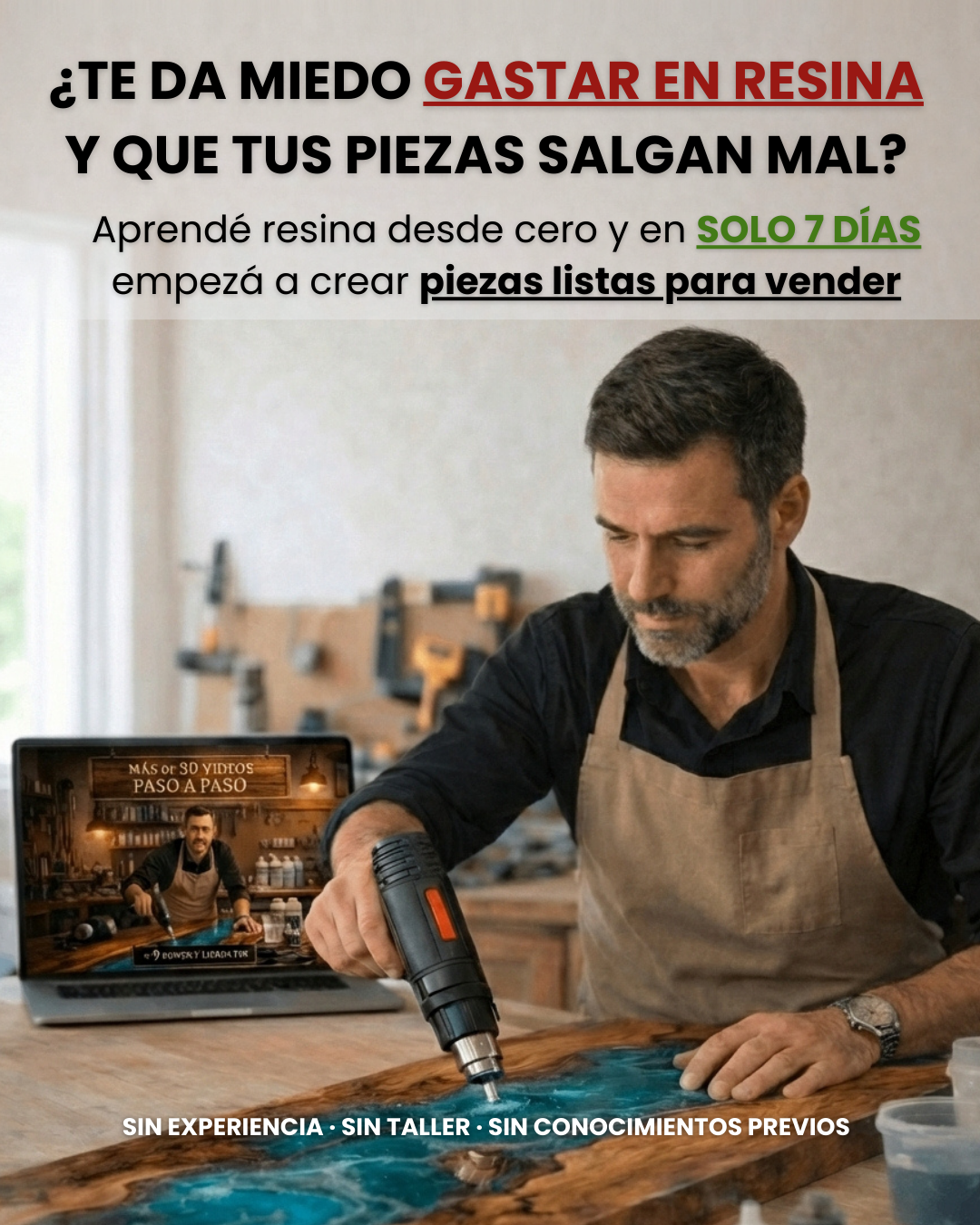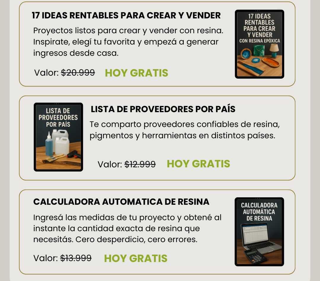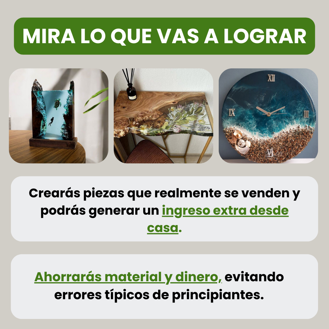 Vas a aprender paso a paso cómo crear mesas, lámparas, relojes y piezas decorativas con resina epóxica desde cero.