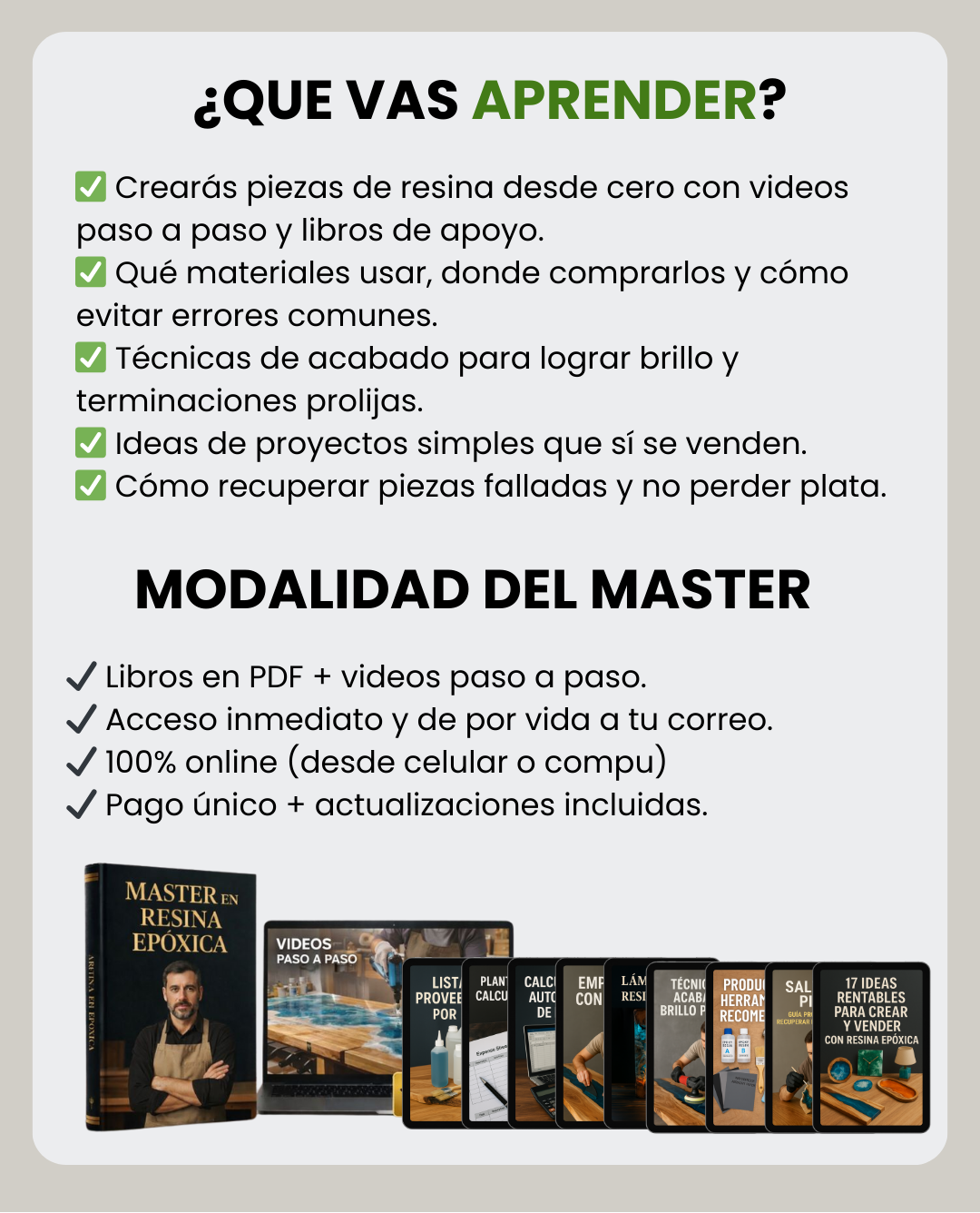 Incluye materiales, proporciones, tiempos de secado, técnicas de brillo espejo y hasta consejos para vender tus creaciones💎